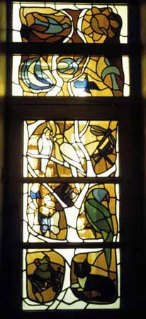 The city is surrounded by the title in Yiddish writing, translated from the Hebrew characters. The water flowing from the sea is a metaphor for spiritual nourishment. The individual glass pieces are suggestive of a mosaic.