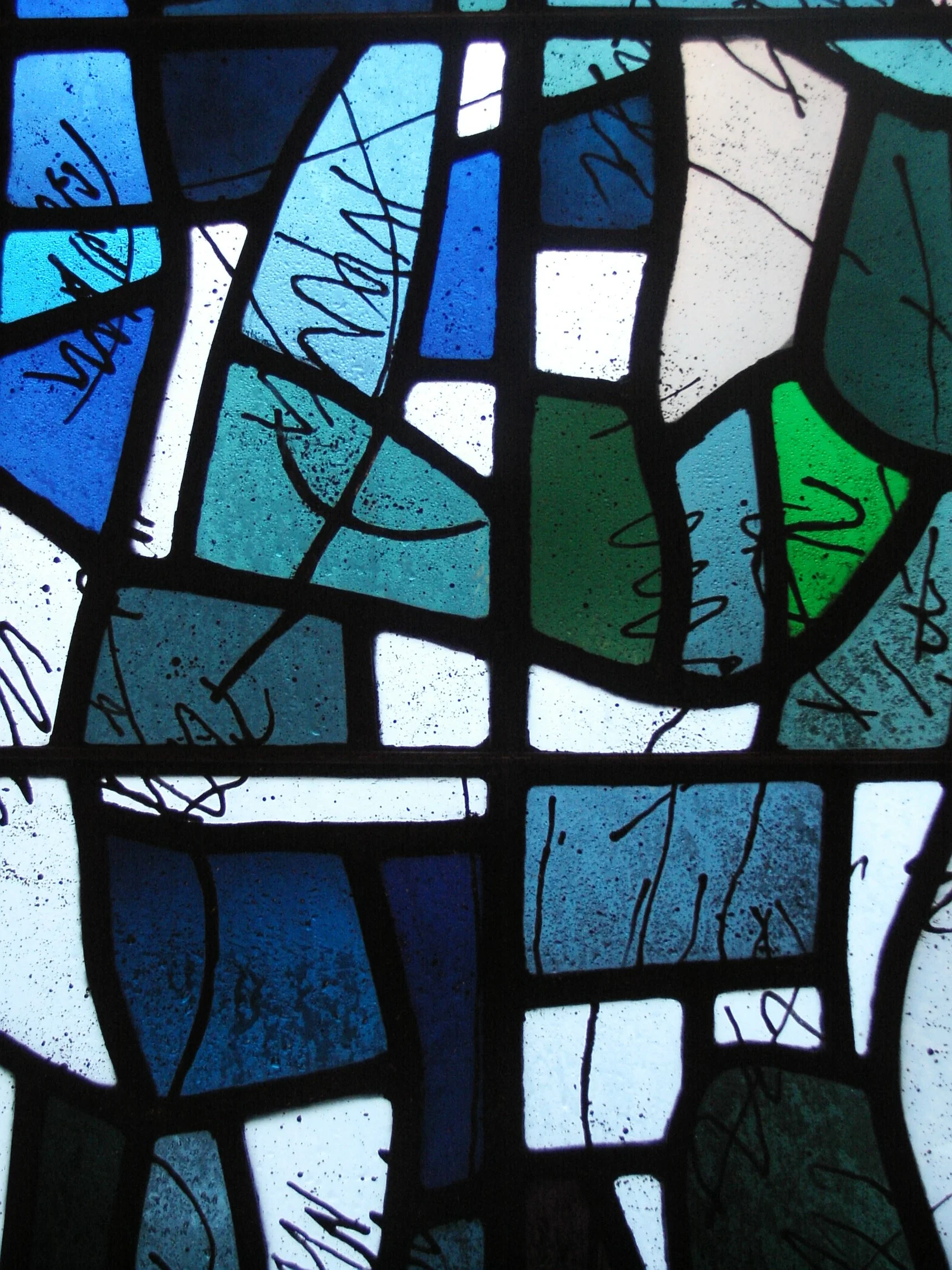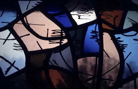 Antique leaded glass; acid etched, screen printed, painted and sand-blasted
